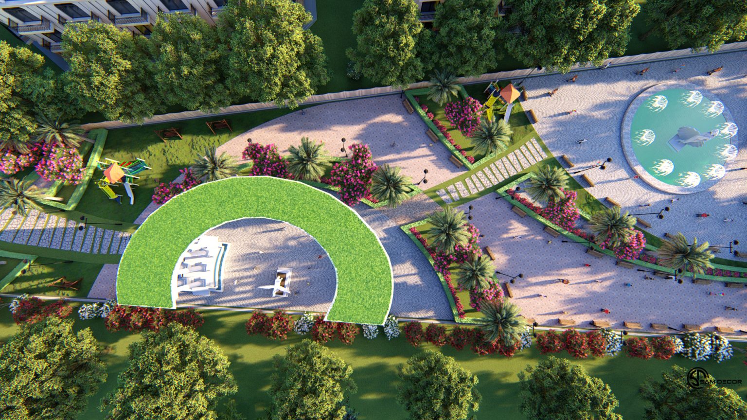 Hệ thống công viên cây xanh với 2 ngàn cây xanh 10 năm tuổi đem lại không gian sống trong lành cho cư dân. Ngoài ra cơ sở hạ tầng công viên, đường nhựa 14m – 17,5m – 25m – 37m, vỉa hè, điện âm, nước máy đạt tiêu chuẩn đã được Chủ Đầu Tư hoàn thiện.