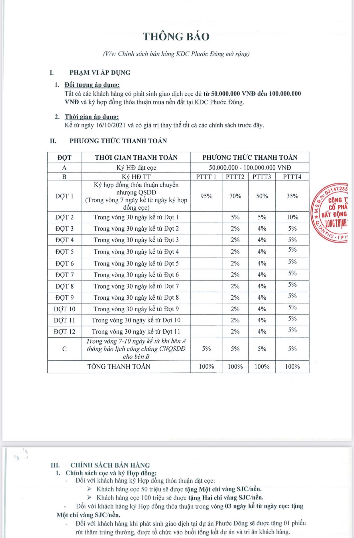 Đặt cọc ———-> thanh toán 50% còn lại góp 12 tháng không tính lãi xuất.