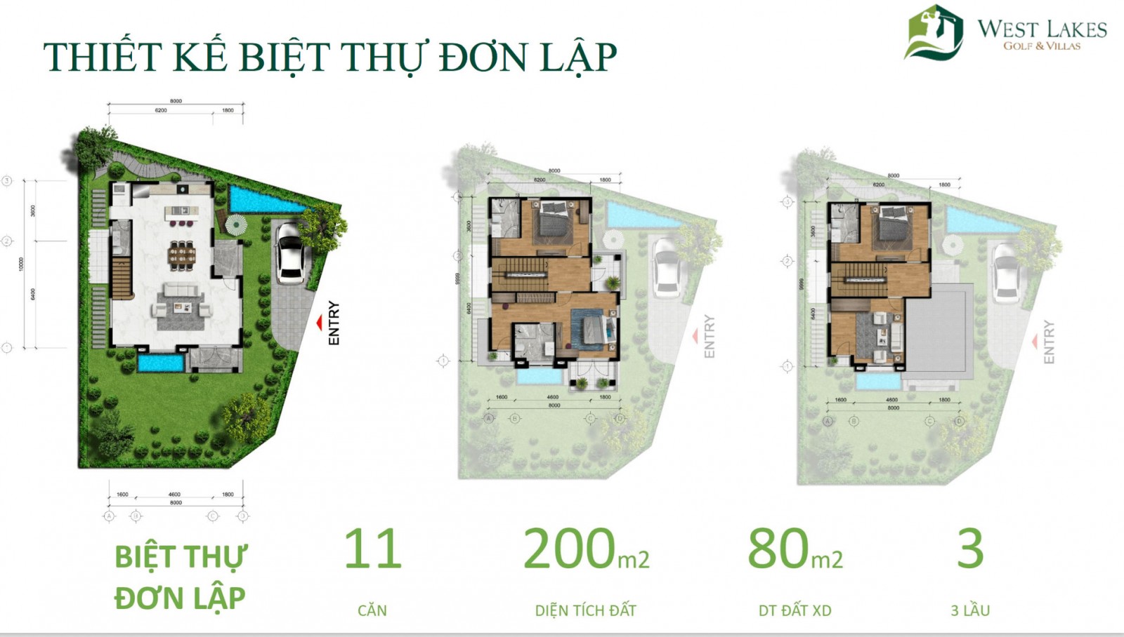 West Lakes Goft & Villas có tổng quy mô 200ha trong đó diện tích khu biệt thự là 75ha bao gồm409 căn biệt thự mini,11 căn biệt thự đơn lậpvà117 căn biệt thự song lậpvới diện tích khu xây dựng.